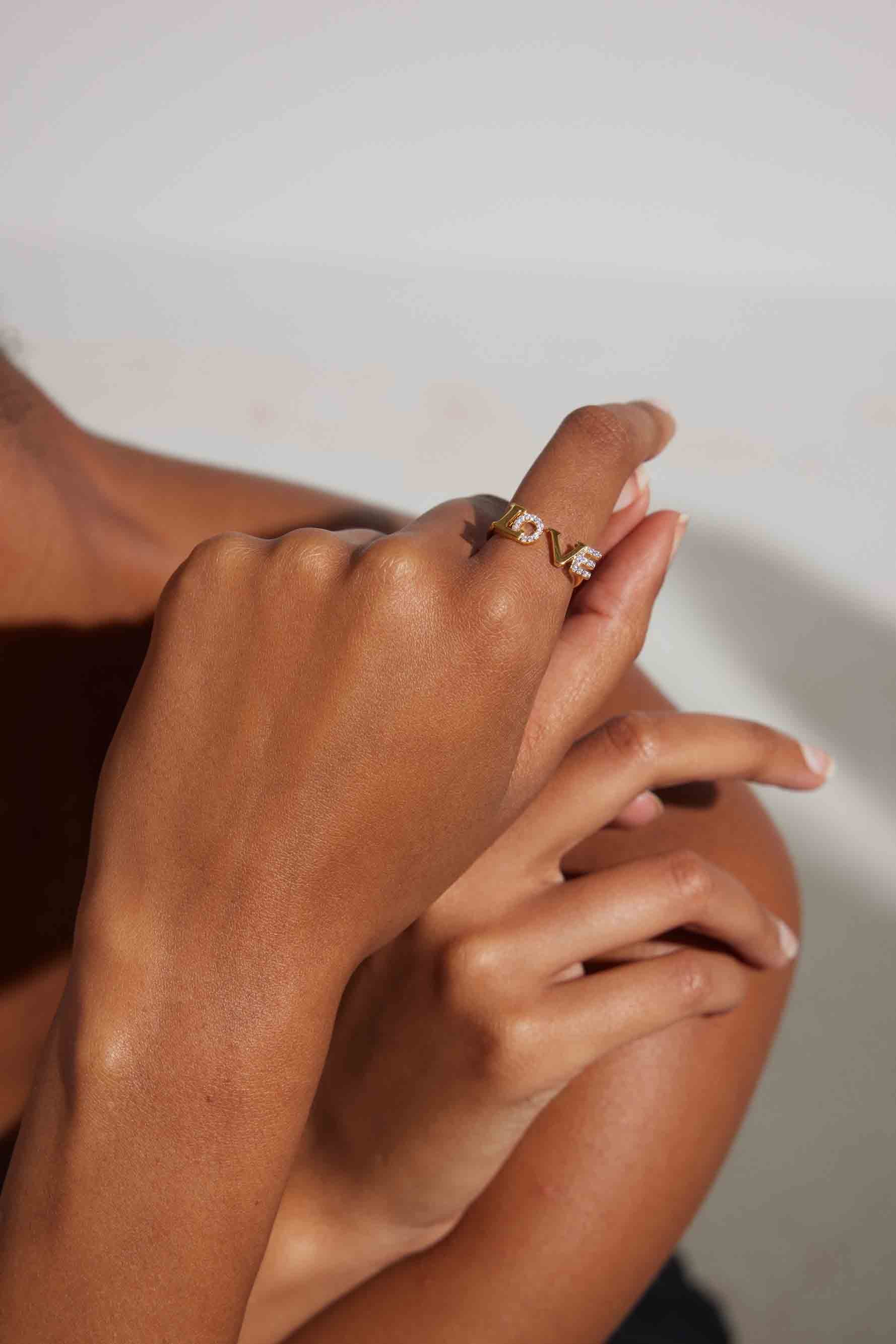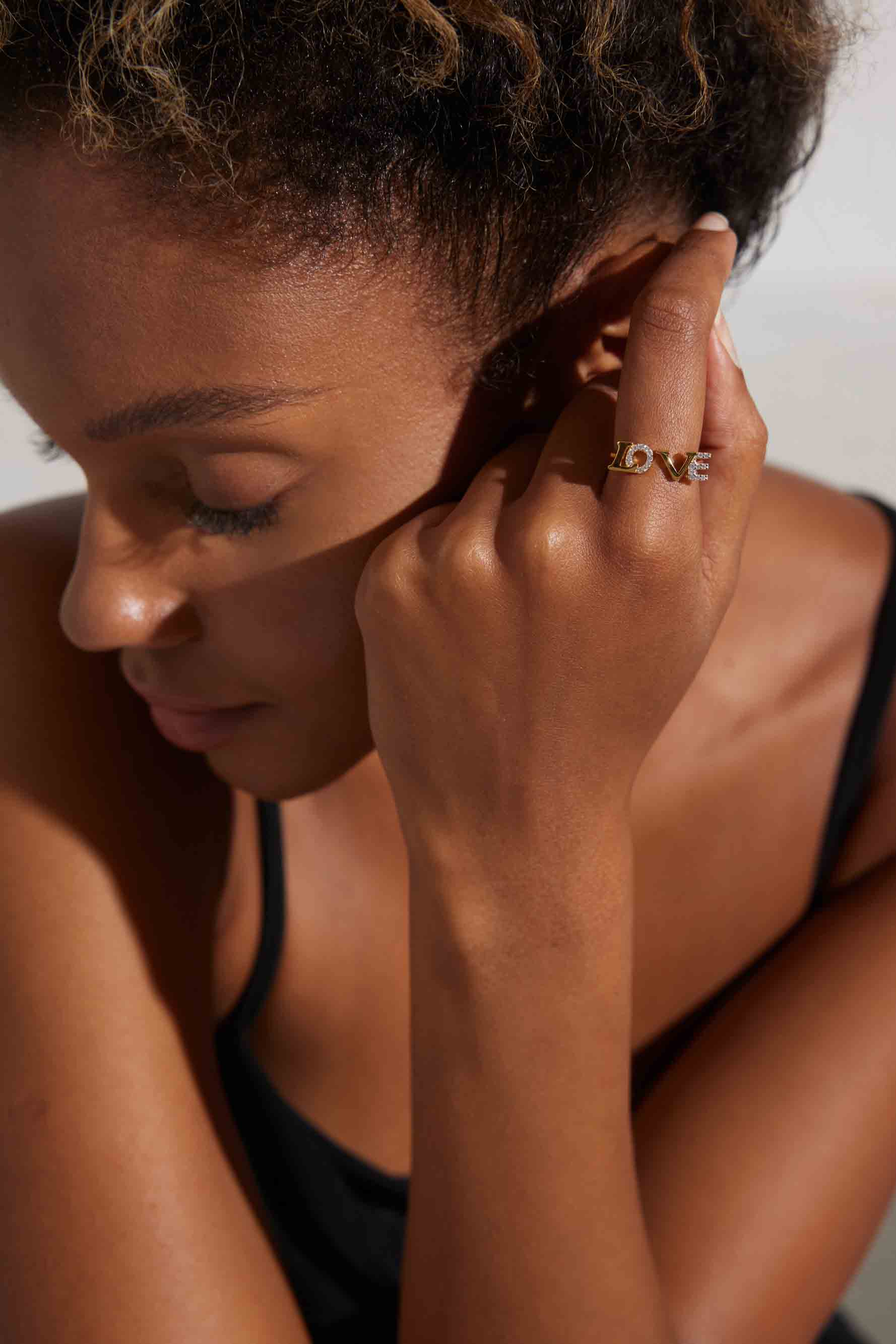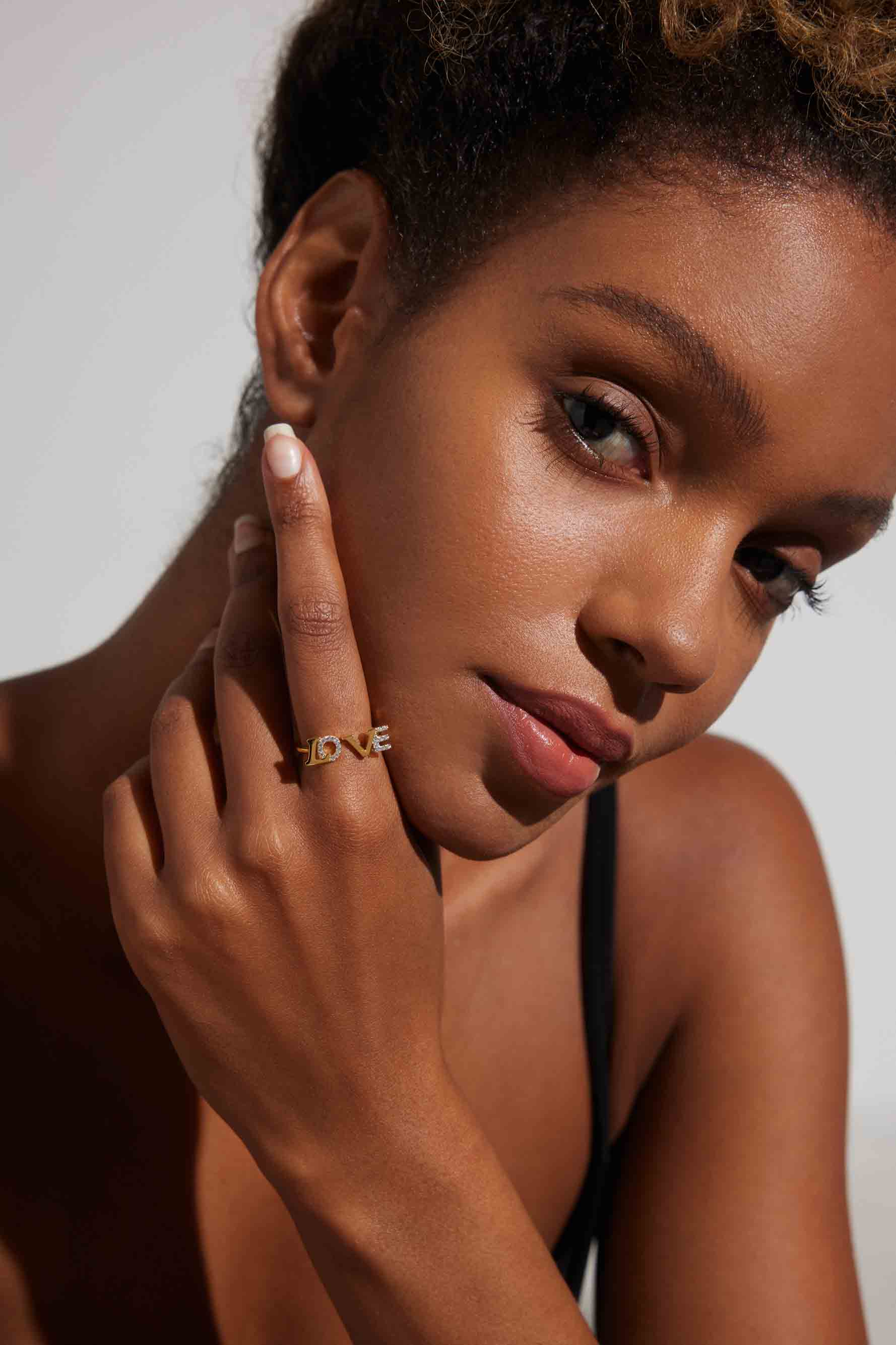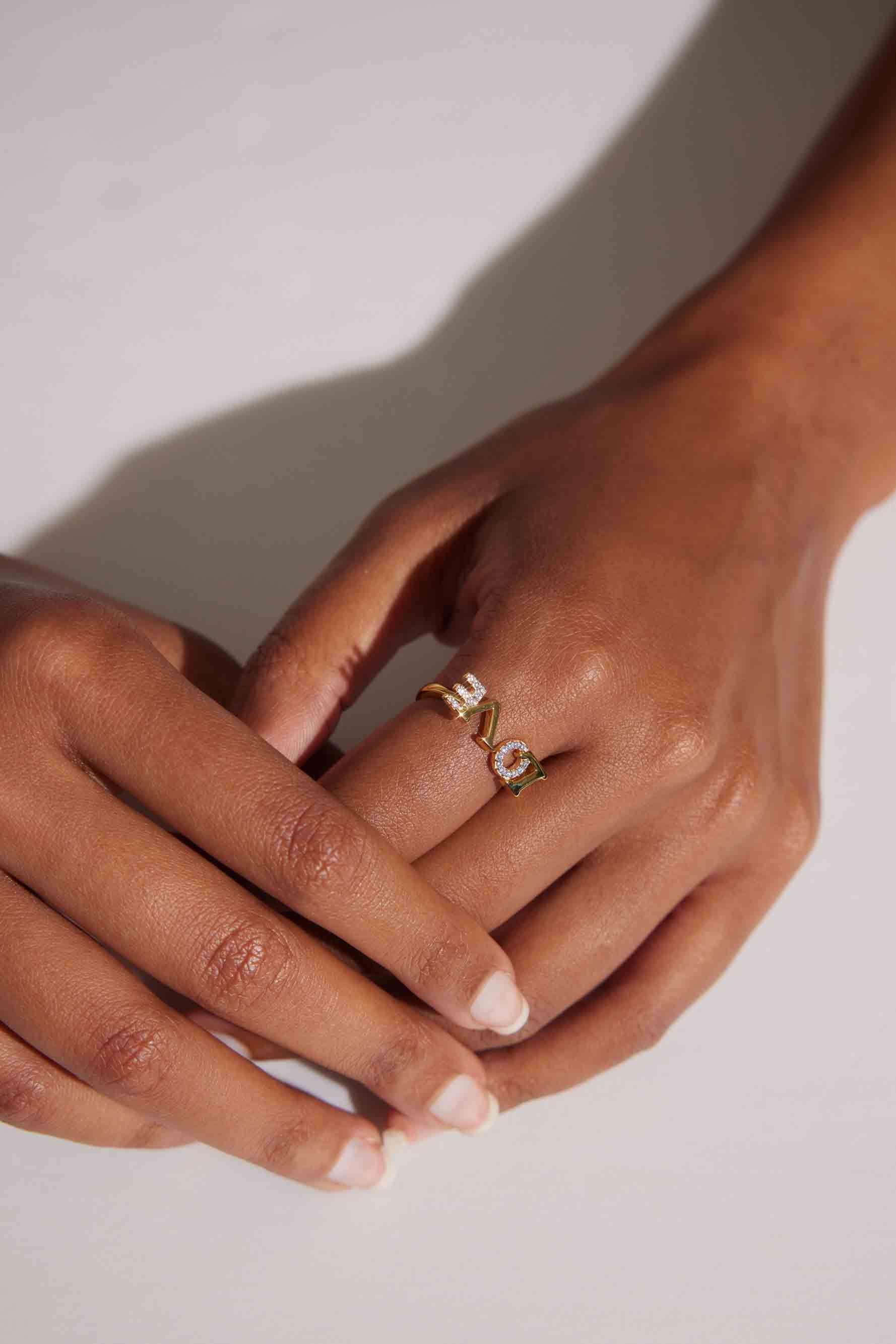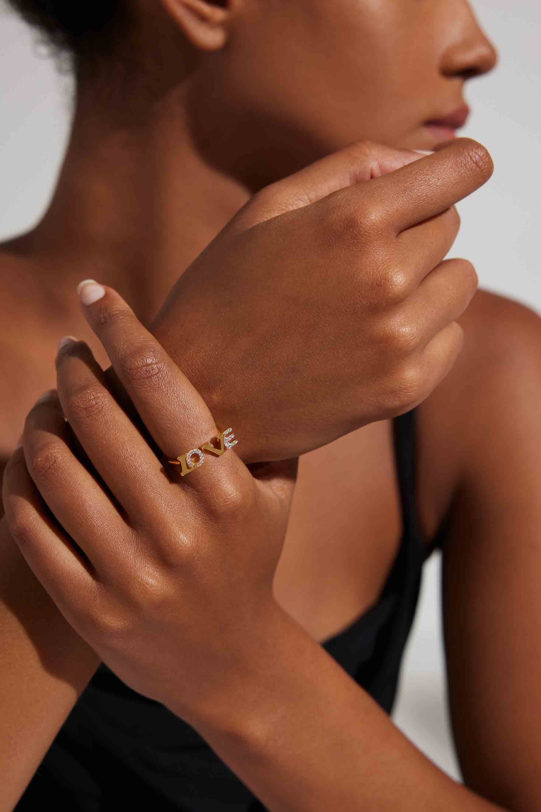 Mixed Diamond Personalized Monogram Ring, this is the most personalized style in Kira's opinion, the LOVE design is very three-dimensional with the entire L O V E letter suspended on the ring, a very tasteful choice for your gift to yourself or your bestie.