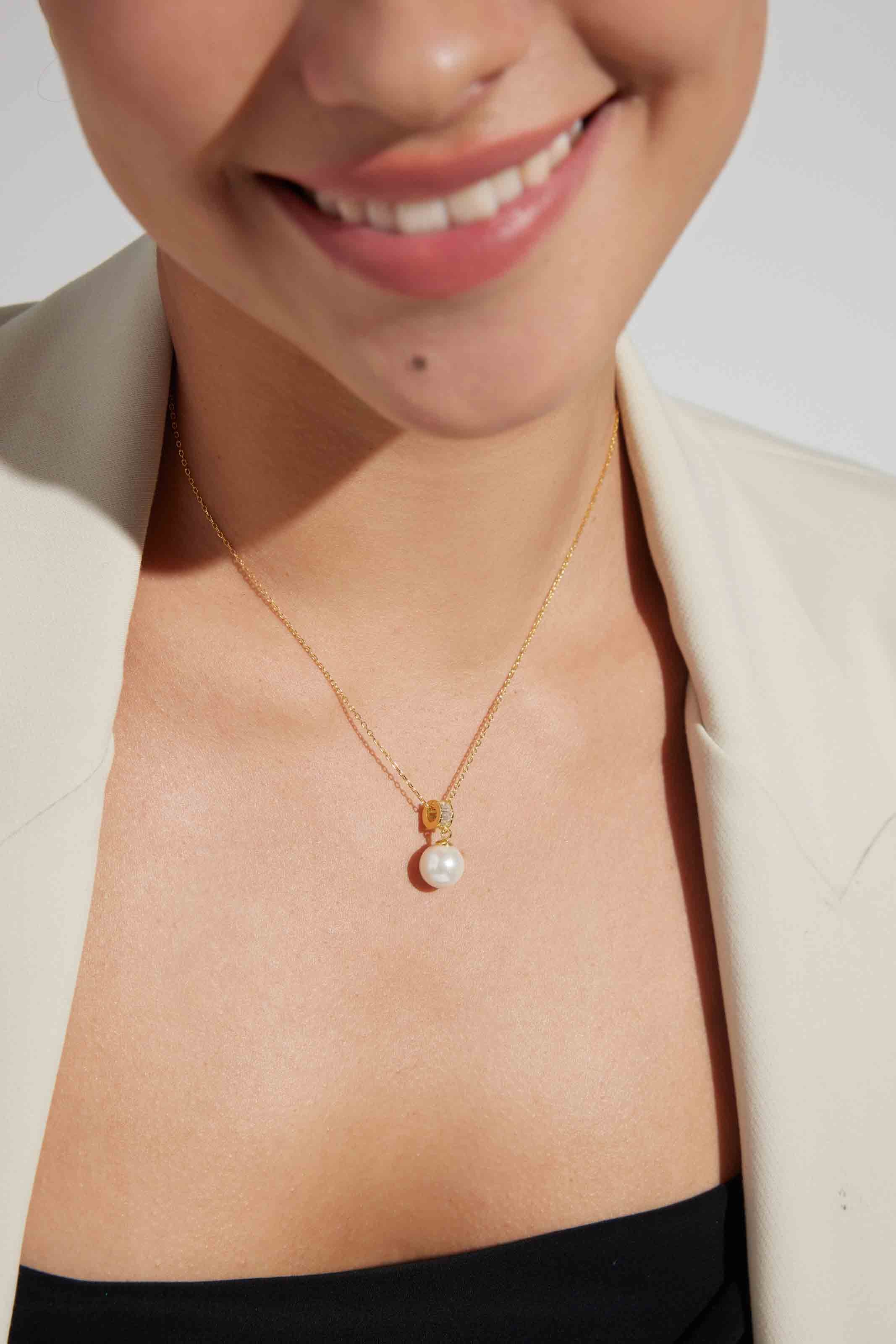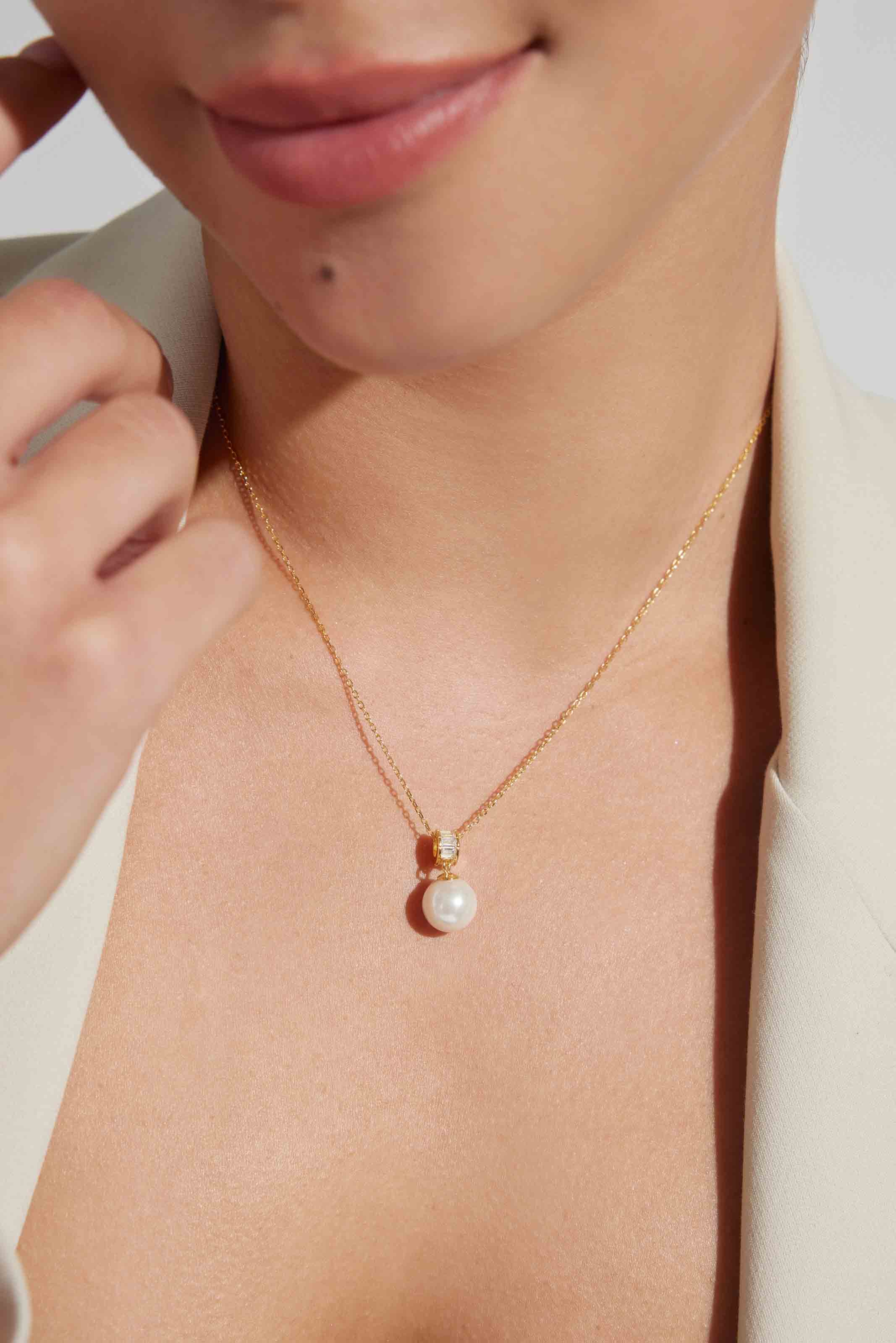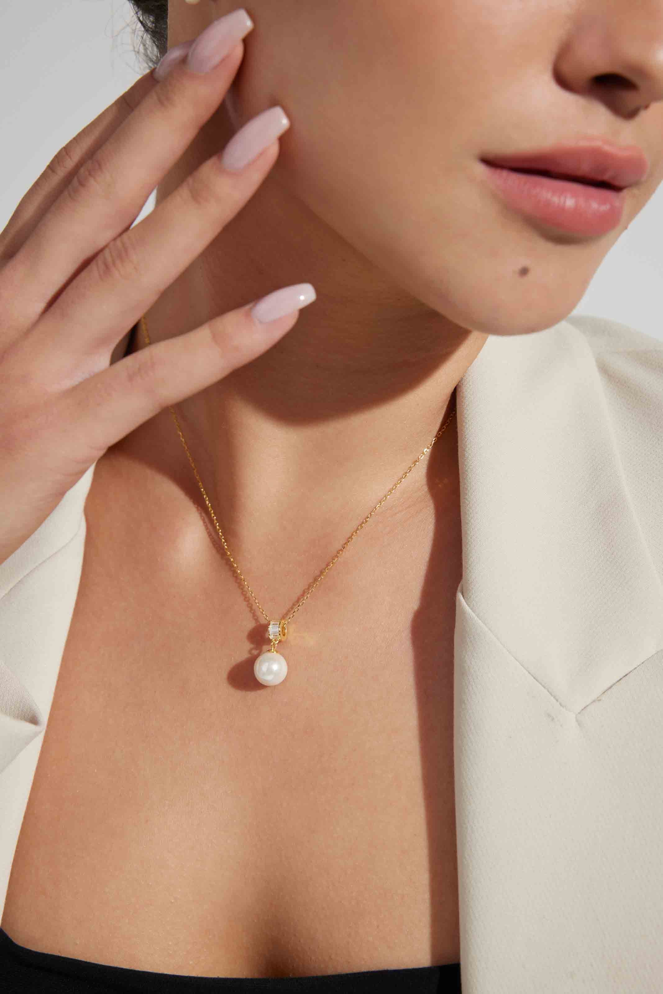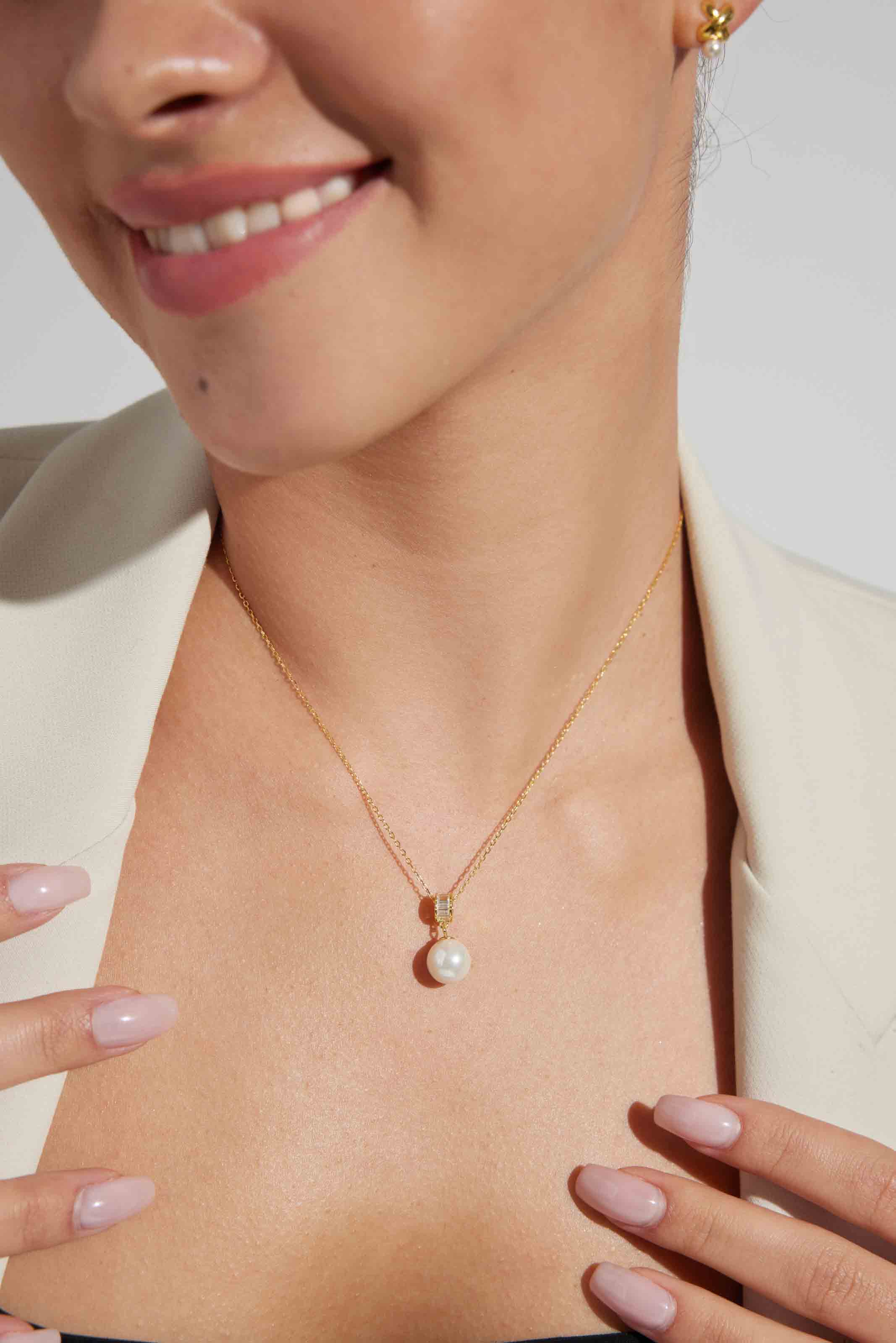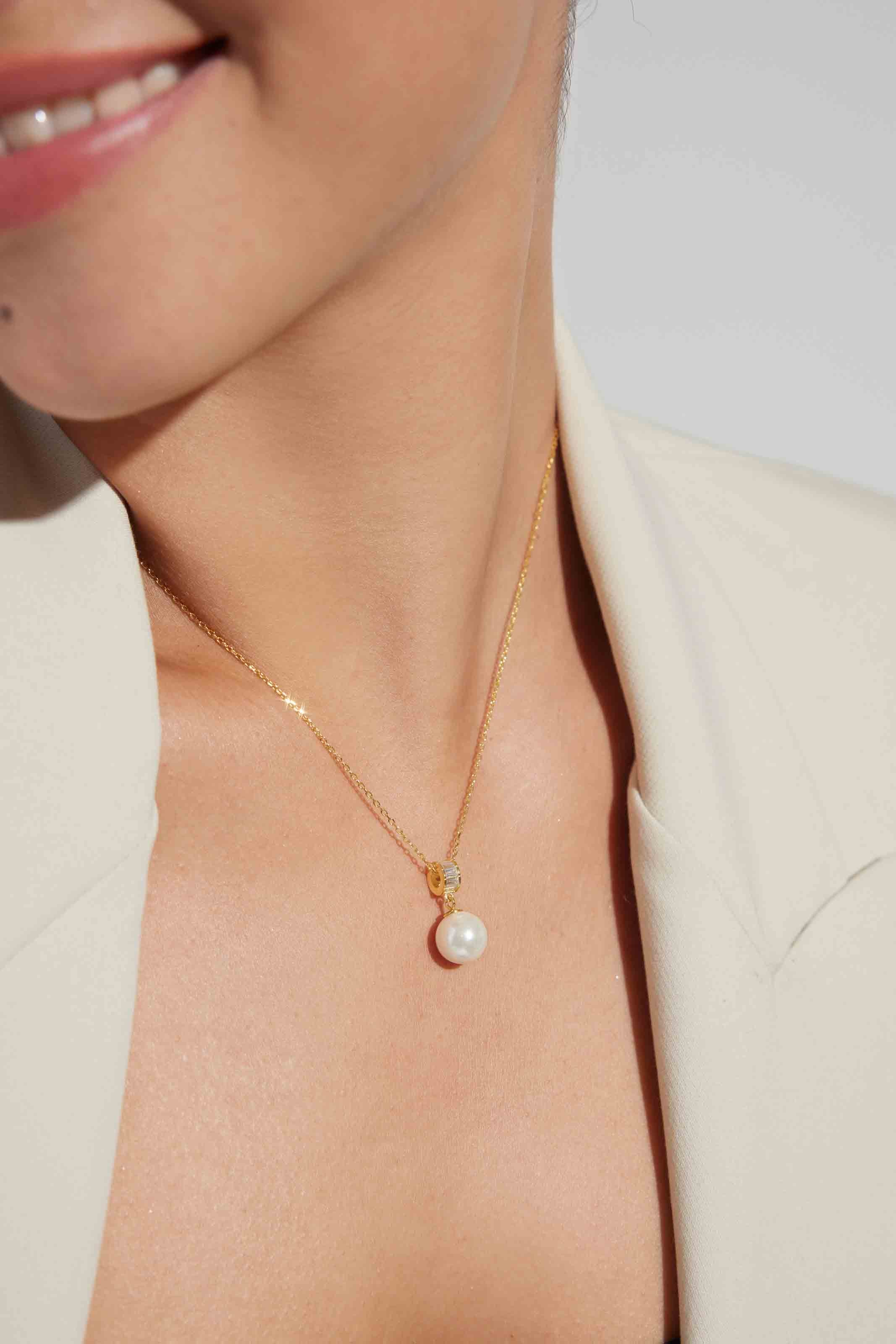 Our Felicity Necklace – it's like a ray of sunshine on a breezy morning walk. The delicate chain sways gently, with a delicate roller pendant hanging from it. And beneath it? A lustrous pearl that shimmers like a secret treasure, bringing to mind those carefree days spent wandering the shore. This necklace? It's a little piece of everyday magic, ready to brighten your world.