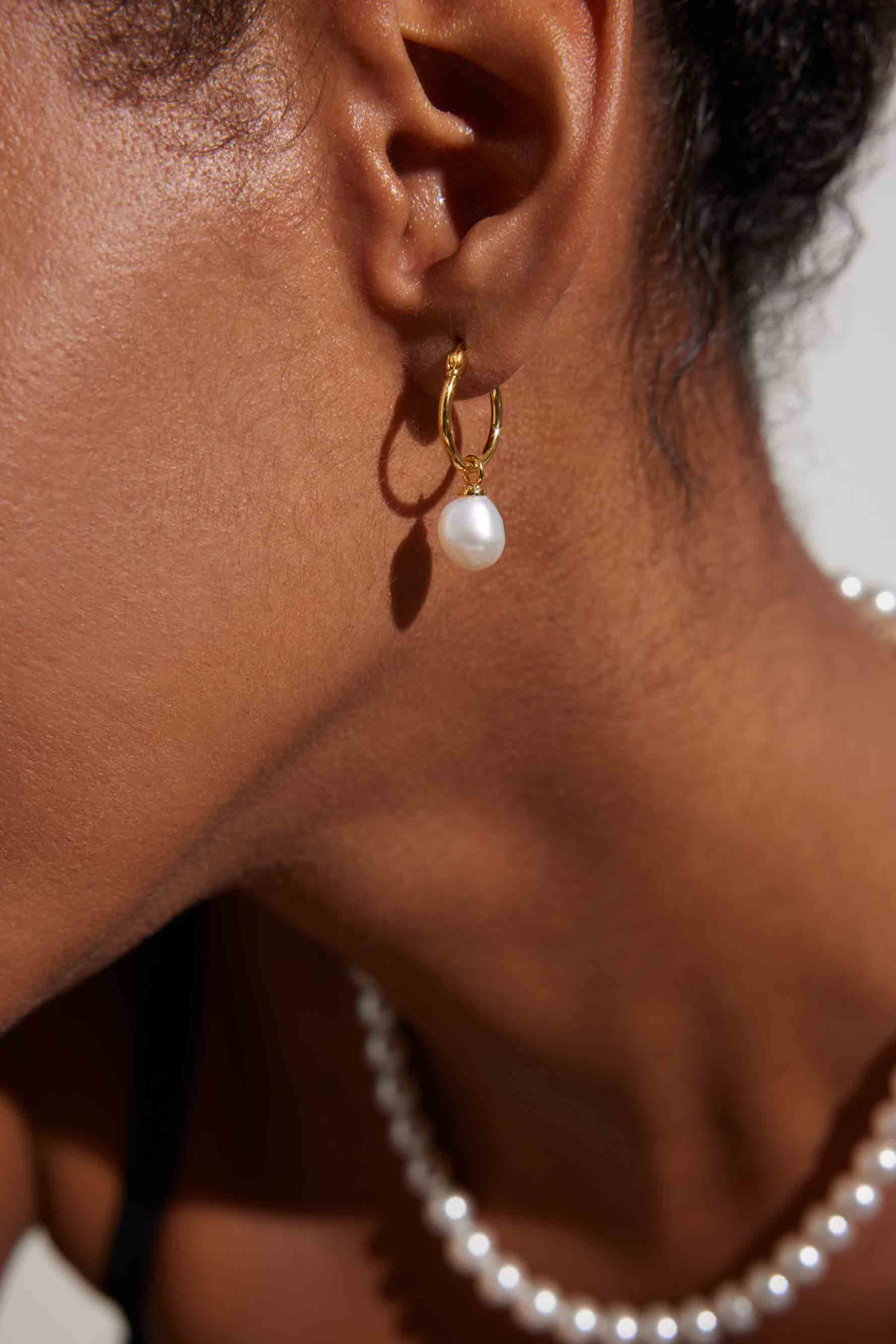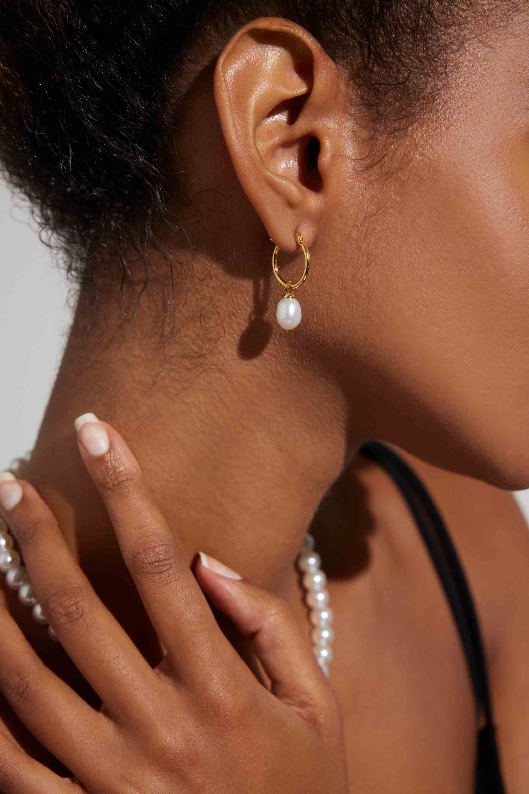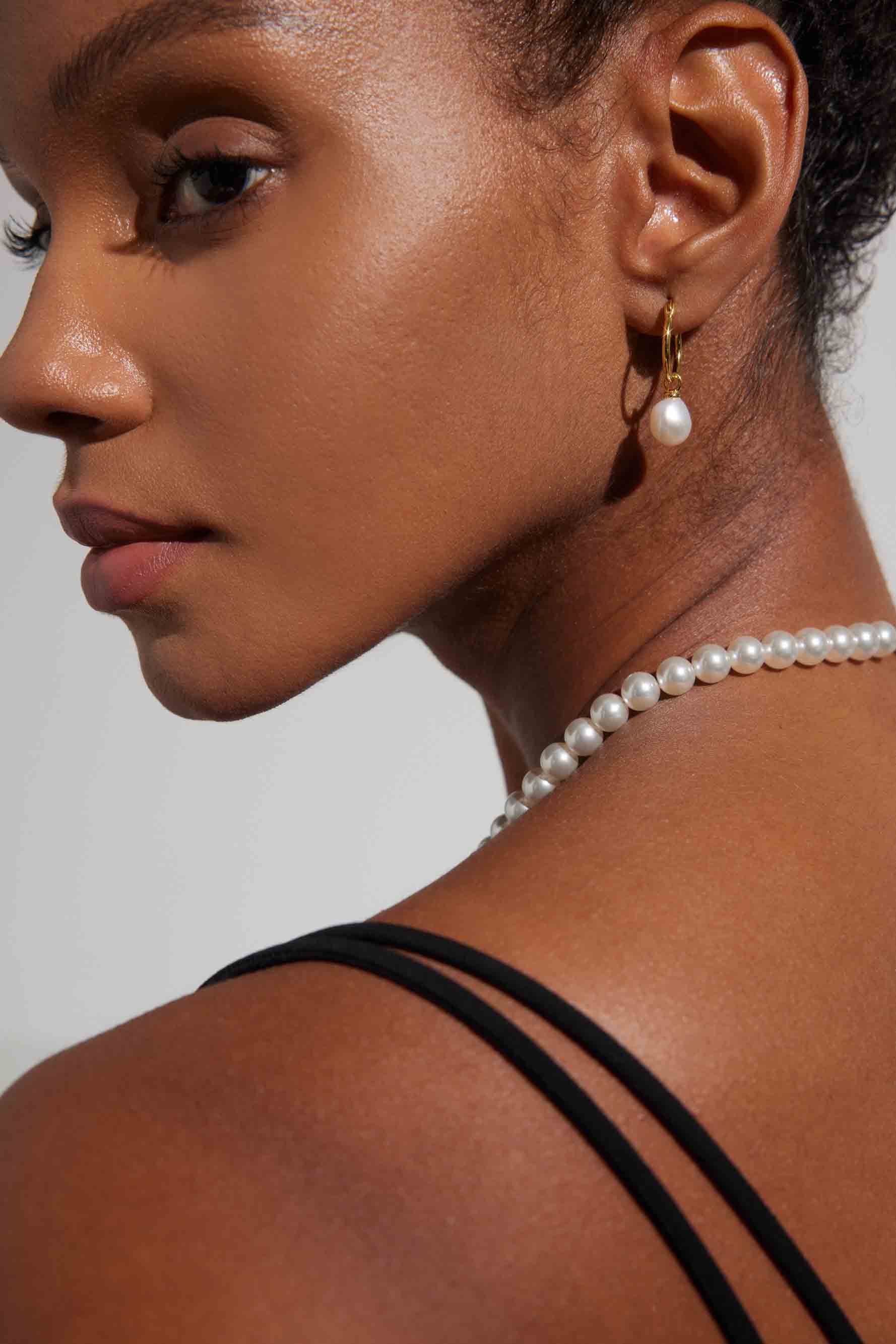 • Sleek gold huggie hoop earrings with natural freshwater pearls