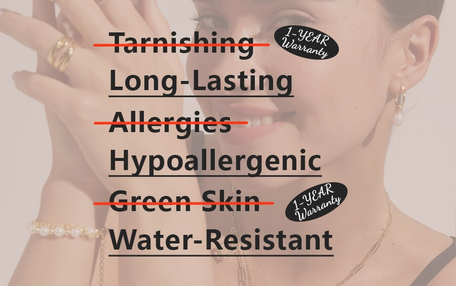 Our jewelry sustainably handmade in 18K Gold Vermeil and solid Sterling Silver. 18K Gold Vermeil is made by pressure bonding a thick layer of 18K Gold to a sterling silver core. The gold layer is 10x thicker than Gold Plating.And at a tenth of the price of solid gold. It is the best alternative to solid 18K Gold. You can wear your gold vermeil jewelry 24/7 for decades without worrying about tarnishing or the gold layer wearing off, and it is easy and safe to clean!