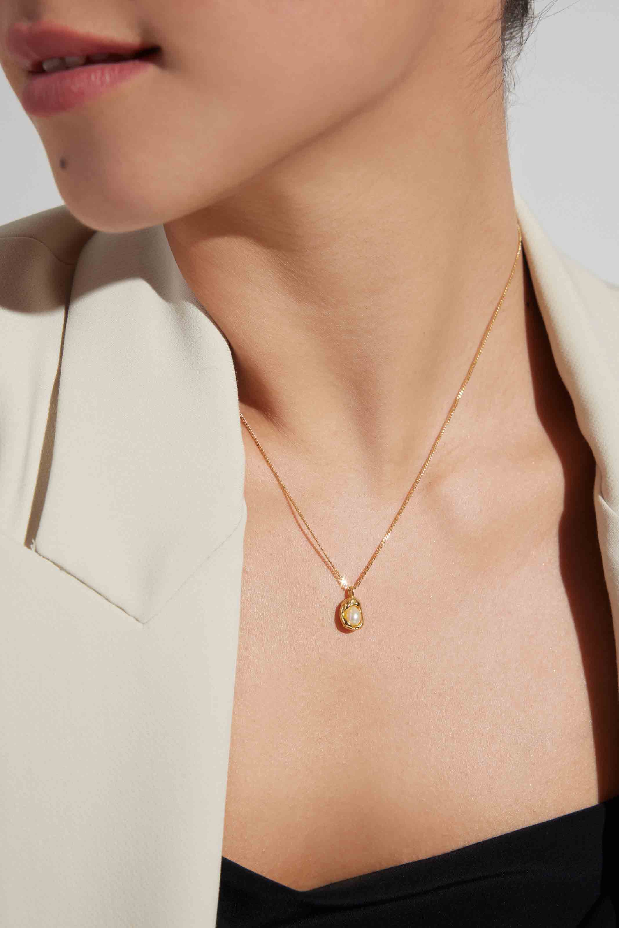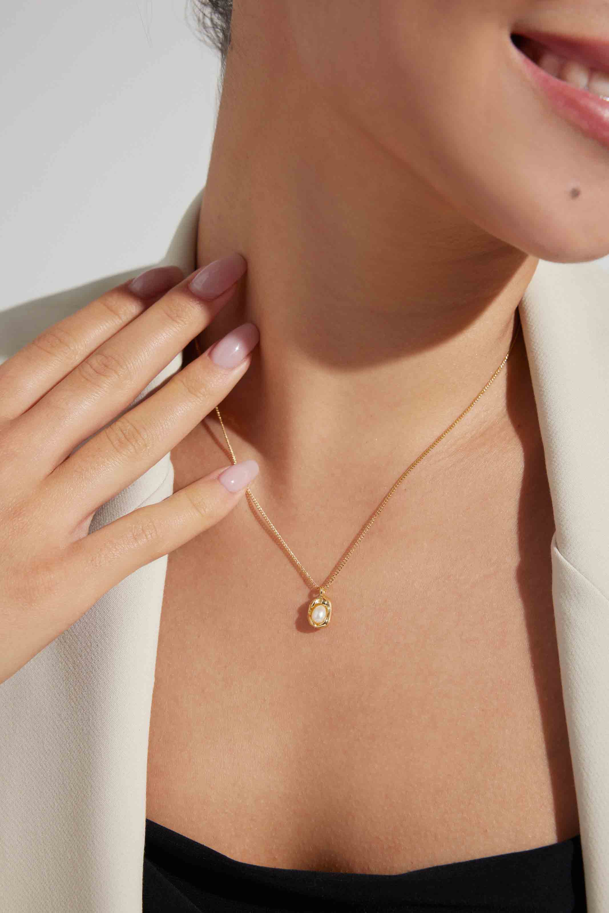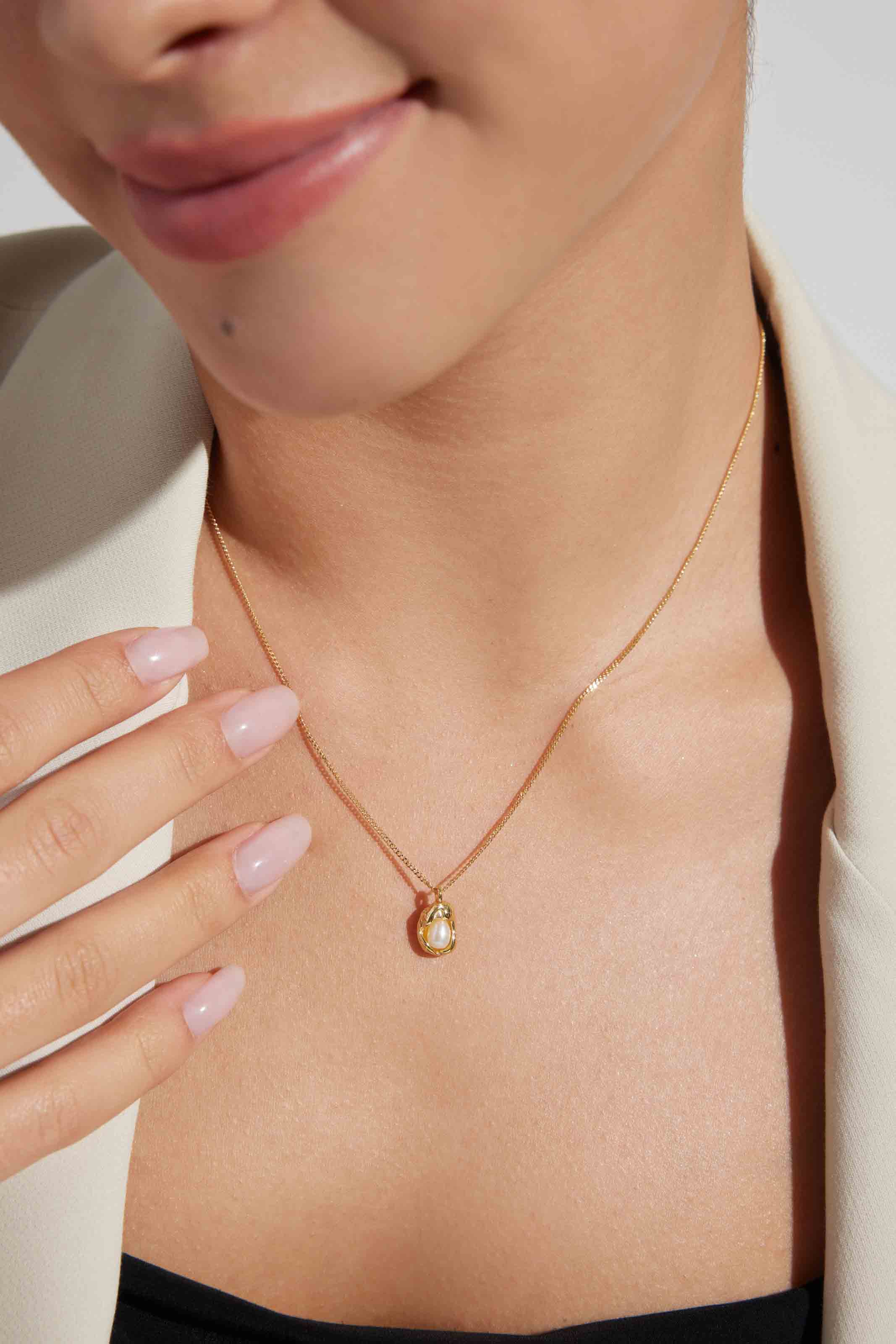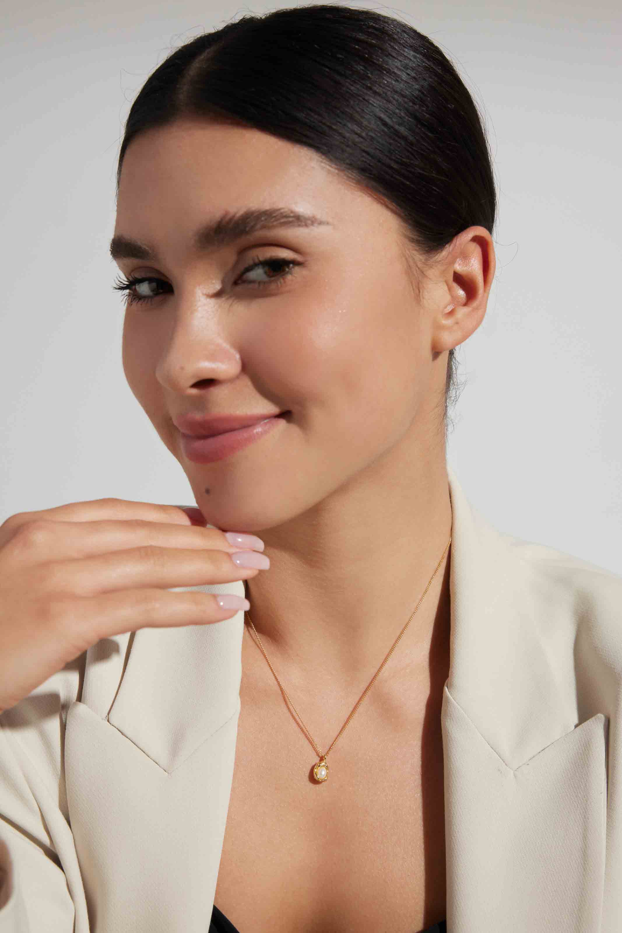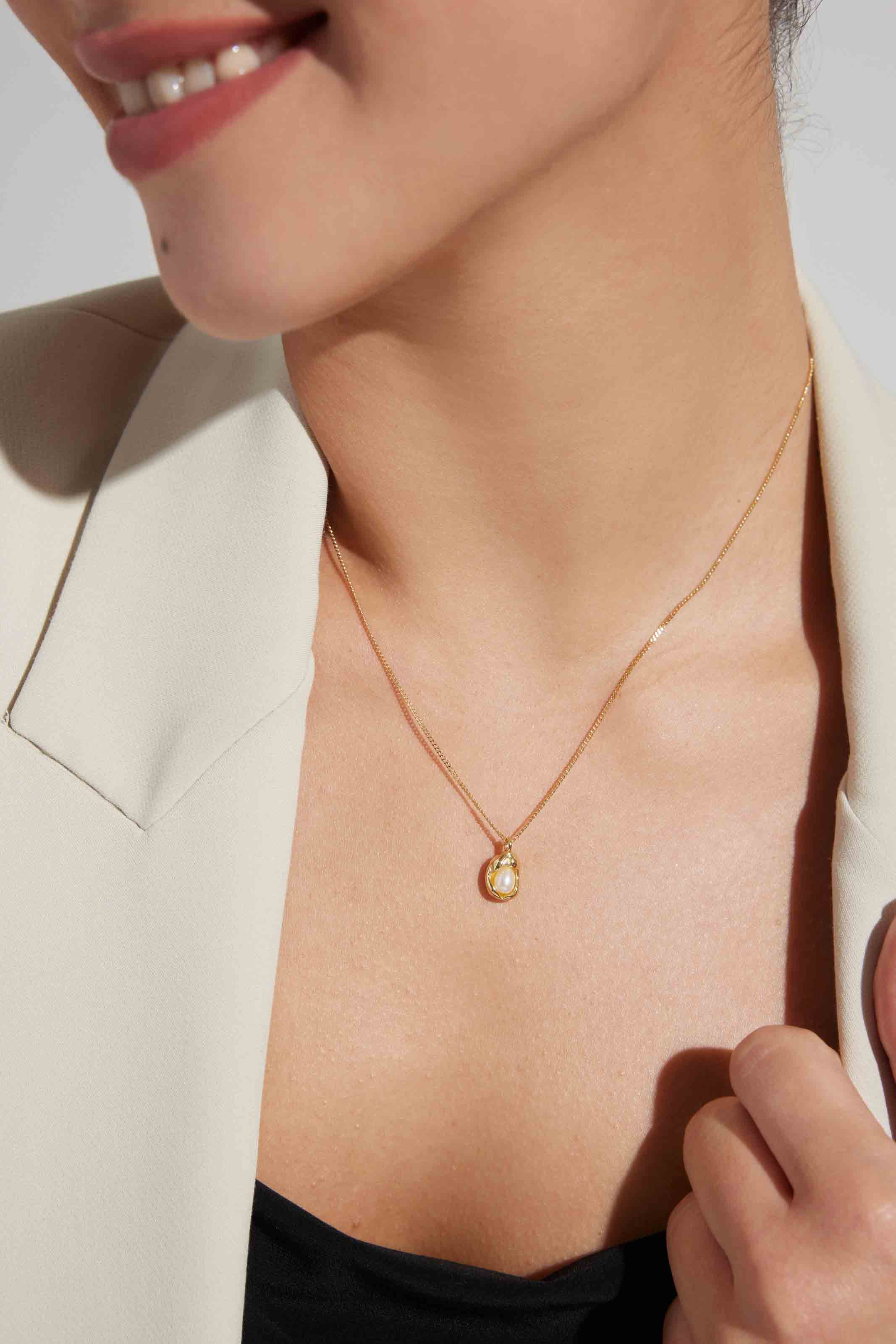 Meet this Sparkle Necklace—a tribute to the beauty of the sea. Crafted in the shape of a delicate shell, this pendant features intricate details and features a sparkling pearl set within its curves. One summer day, she sets out for a solitary walk along the shore, the Sparkle Necklace adorning her neck like a precious treasure. As she strolls along the sandy beach, the pendant glints in the sunlight, casting mesmerizing reflections on the glistening waves.