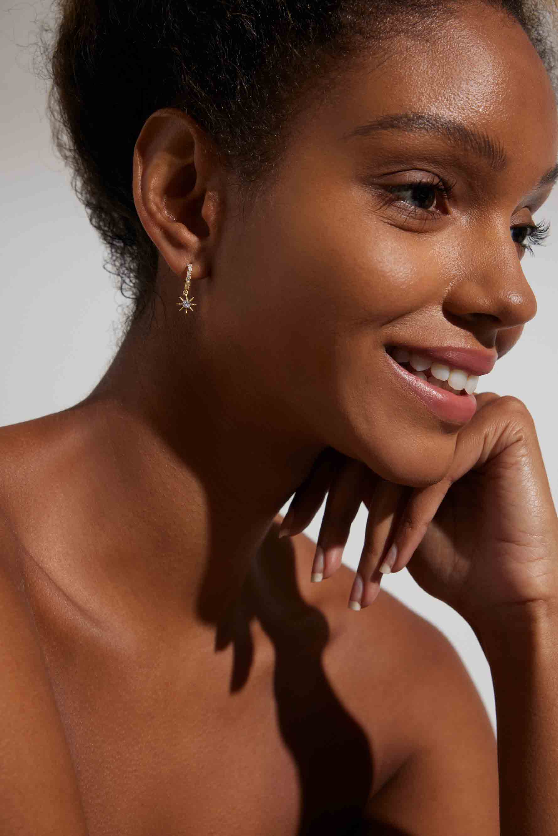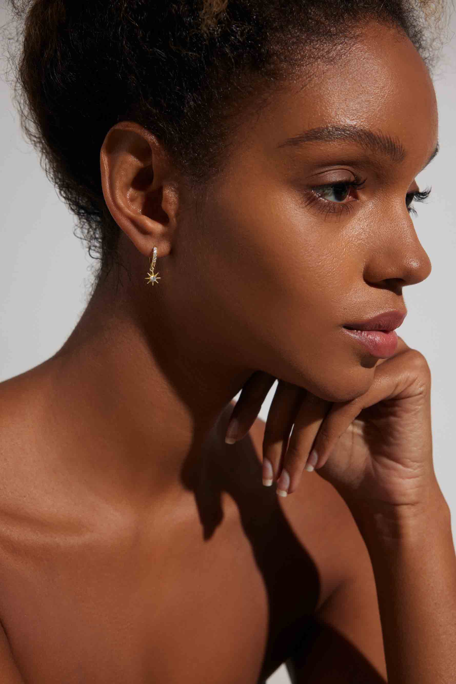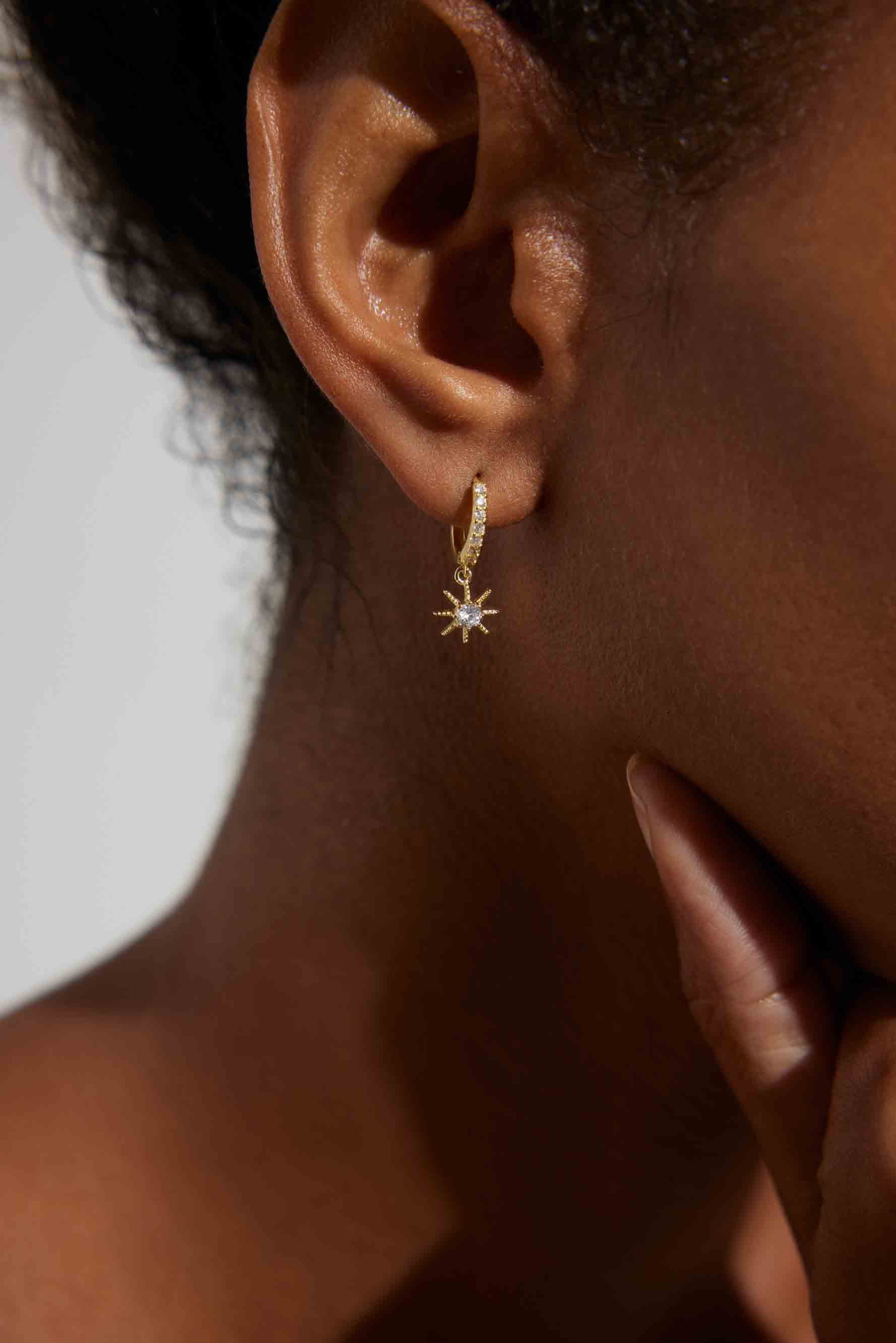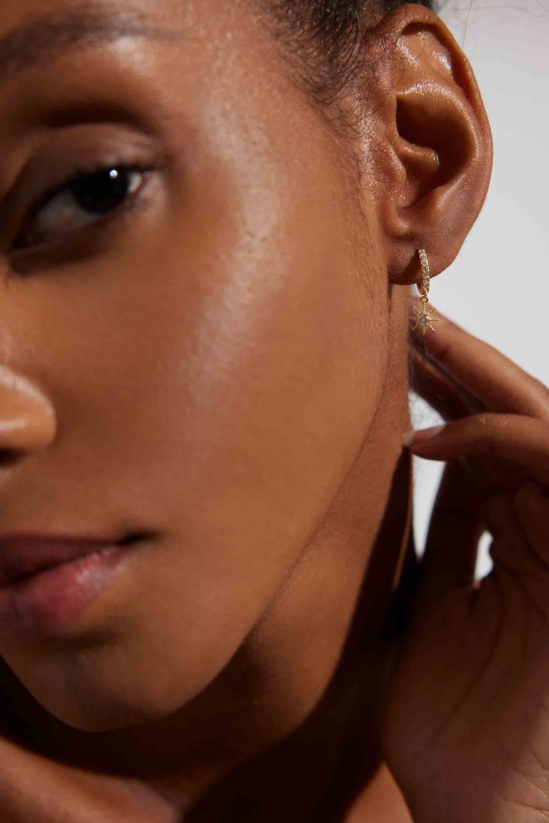 Hey, check out our Star Hoop Earrings—they're like a mini galaxy for your ears! These cute little hoop earrings are all decked out recycled sterling silver finished in 18K gold , with half of them sparkling with diamonds for that extra glam. And check out the pendant—it's shaped like a star, with a dazzling diamond right in the middle, shining bright like the night sky.